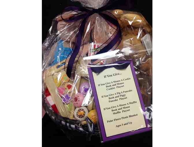 Beloved children’s books, If You Give a Mouse a Cookie, If You Give a Pig a Pancake and If You Give a Moose a Muffin books, stuffed animals, play sets and a fleece picnic blanket pack this fun basket.