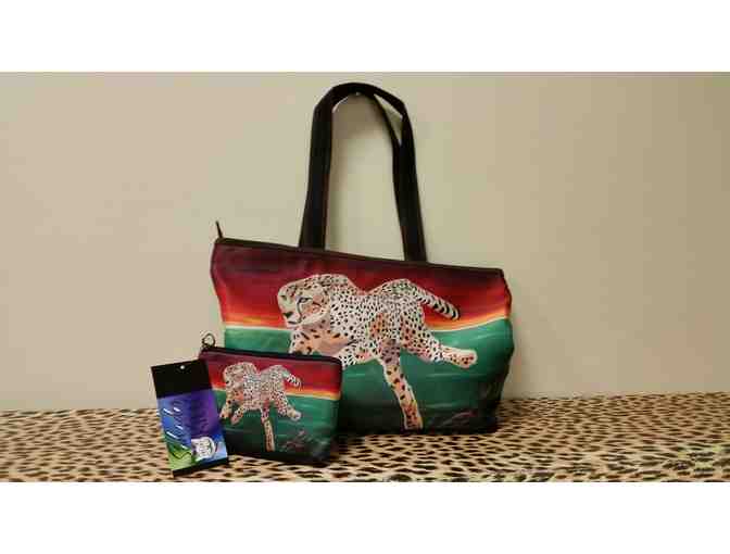 One Salvador Kitti crossbody double zipper bag with a matching change purse. Artwork by Amy Pugh made into a fashionable and colorful bag. Dr. Marker loves these bags!