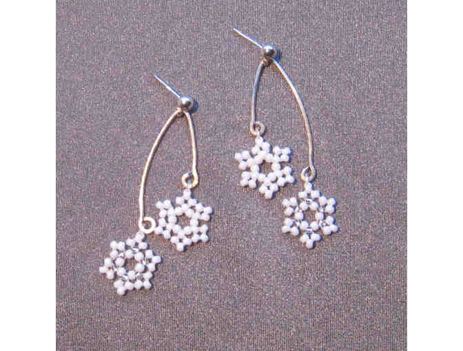 These earrings have been handmade by Linda Moul. Each snowflake has been beaded using tiny glass seedbeads. The wire is forged sterling silver along with sterling silver ear posts. Each earring is approximately 2 inches long. The snowflakes are each about 1/2 inch in diameter.
