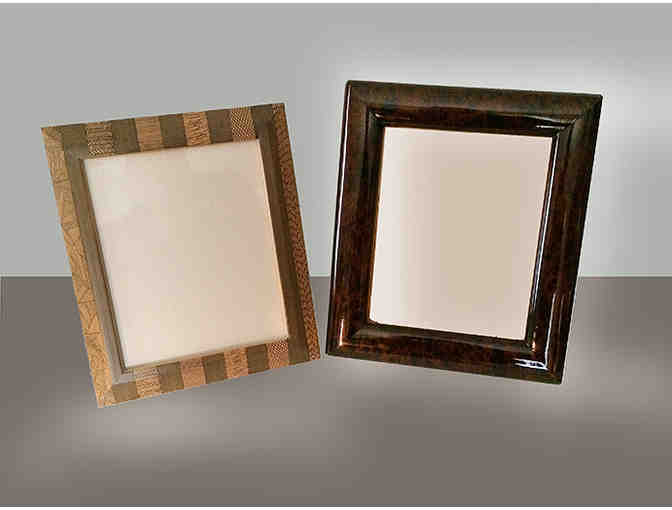 (1) a wooden 12 1/2" x 10 1/2" frame holds a 10" x 8" photo/image with fabric design pattern, made by and signed, M. Rothschild for STEVE, Beverly Hills. (2) 13 1/2" x 11 1/2" holds a 10" x 8" photo/image.