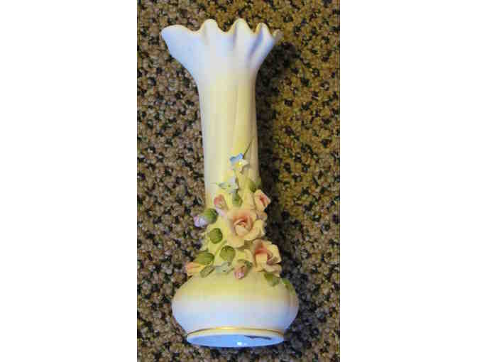The flowers are the hand painted iconic roses and forget-me-nots. The flowers are in nice shape! The inside is a shiny glaze for the placement of flowers if you wanted to. It would make a nice addition to someone's collection of Lefton or a nice starter piece.