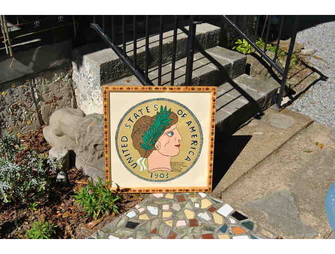 This rare framed print was created from the likeness of a 1903 dime by Howard Finster. It is 39 out of a unique run of only 100 prints. 22 3/4" x 22 1/2" it is signed by the artist. The framing was created using a system of wood etching by the artist as well.