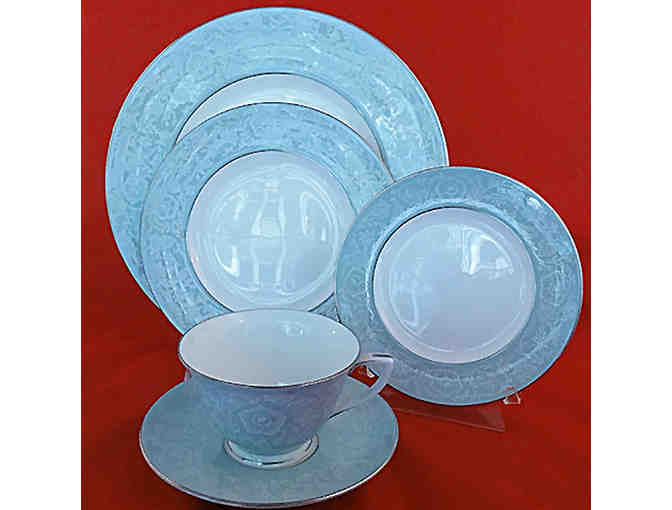 Eight five-piece place settings. dinner plate, salad plate, bread plate, cup and saucer.