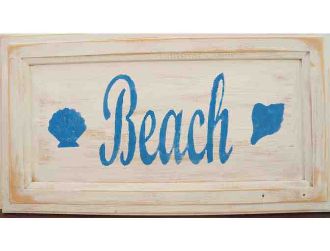 Shabby Chic Sign with hanger on back. Creamy cottage white with brilliant sea blue font of "Beach" Measures 25"x 14".