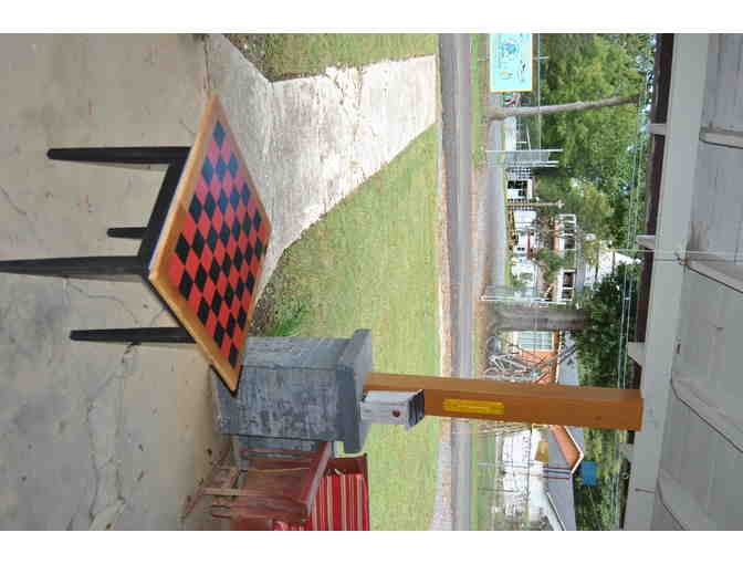 This folksy Checkerboard table is perfect for the game room or weekend cabin. It is 3' in Height and 36" x 36". the Checkers were created from recycled objects from Paradise Garden.