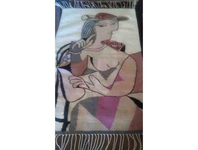 This "Picasso" rug is a new handwoven rug from Oaxaca, Mexico. The colors are lavender, beige, cocoa, grey and black on a neutral ground. It can be hung or used as a rug. It measures 48" high x 30" wide, with 6" fringes.