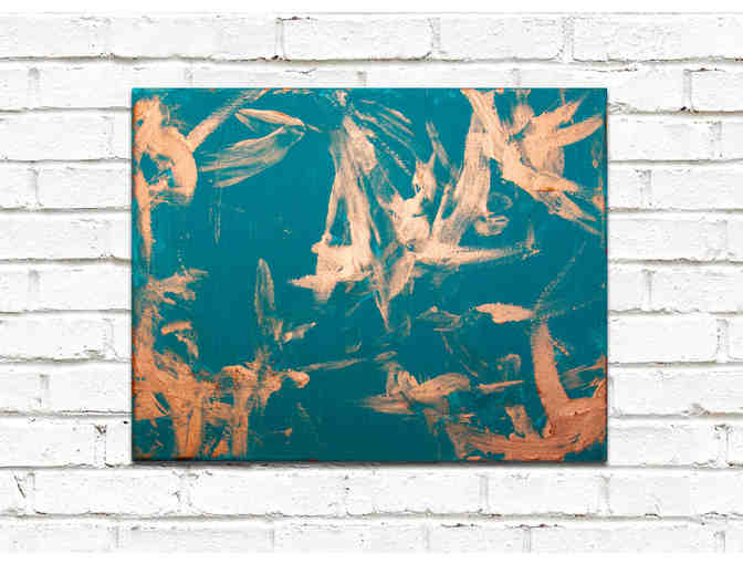 Vibrant shades of orange were the choice of Sumatran orangutan Bernas when he picked up brushes to create this masterpiece. “Junie” as he is commonly known in the cliquish artsy orangutan crowd, wanted to show action and whimsy in this painting where he and his friends swing and frolic high in the tree tops. This is the first in a series that Junie plans to unveil in subsequent fine art exhibits.