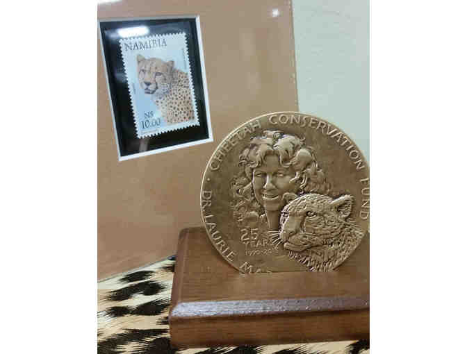 Collectible Medallion commemorating CCF's 25th Anniversary. Has Dr. Marker and a cheetah on one side and Namibia on the other. Features the artwork of renowned sculptor Eugene Daub. The bronze medallion is 2.5 inches and the water along the coast of Namibia is blue enamel. Medallion comes boxed with a wooden display stand.