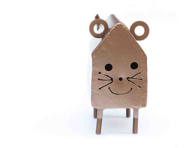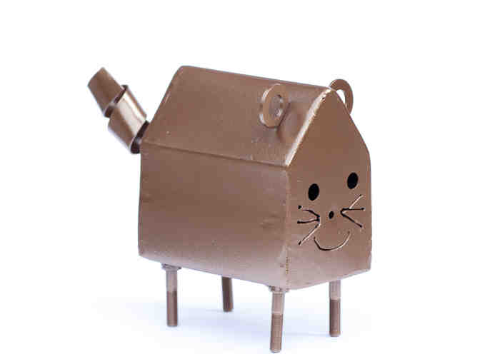 Handmade of reclaimed metal, bolts and washers welded together to create a smiling, sweet kitty that stands 7.5" tall and 3.5" wide. Makes an excellent gift for the cat lover. Can be used as a doorstop, paperweight, centerpiece, friend.