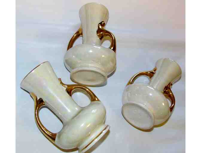 This is a set of three sublime ivory colored opalescent pearl vases in an urn style, made by Pearl China Co of Ohio. Some refer to the finish as iridescent or even lusterware. It is an ivory color with a finish that shines like an opal. The vases have 22-karat gold-plated handles. It is made in United States. Circa 1950s.