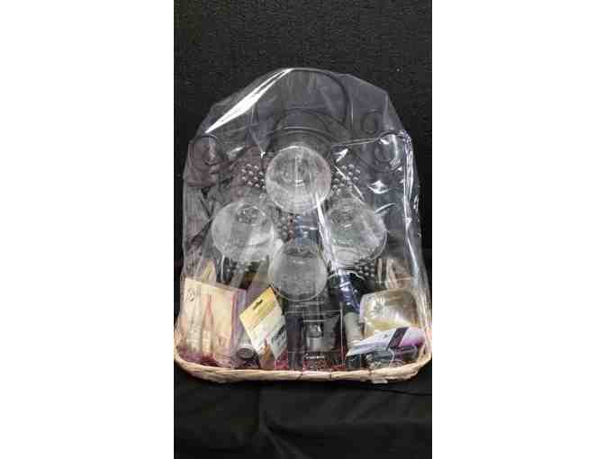 Wine rack is stocked with a bottle of William Hill Cabernet Sauvignon 2013 North Coast and a William Hill Chardonnay 2013 North Coast. Includes 4 Oneida wine glasses, 4 appetizer plates, cocktail napkins, coasters, opener and wine sealer. Get the party started with a $40 Fishers Foods gift certificate.