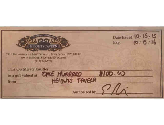 Enjoy this $100 gift certificate that may be redeemed for dinner and/or drinks at Heights Tavern, located at 3910 Broadway at 164th Street, New York, NY 10032.