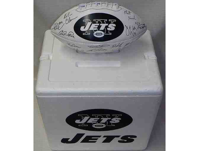 Signed Jets Football and foam tailgate cooler, plus fun supplies for your tailgate party. Stay warm during the game with a fleece stadium blanket (approx. 42" x 54").