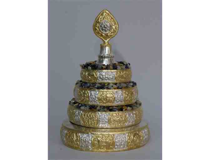 This beautiful gold and silver plated mandala set is an essential item for the Dharma practitioner.  It consists of a 6" base, with three tiers and a finial.  Two pounds of semi-precious stones are included.