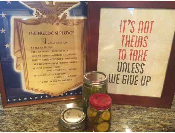 Set of three jars of family favorite homemade pickles: 1 quart garlic dill spears, 1 pint of spicy bread and butter pickle slices, and 1/2 pint jar of sweet and spicy pickle relish. (Sorry, posters not included)