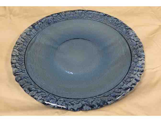The Fire & Light tableware collection is made of hand-poured colored glass, enchanting the viewer with the unique play of light filtering through its colors and textures. This lovely blue colored moonstone platter measures 14" in diameter, making it the perfect addition in your home.