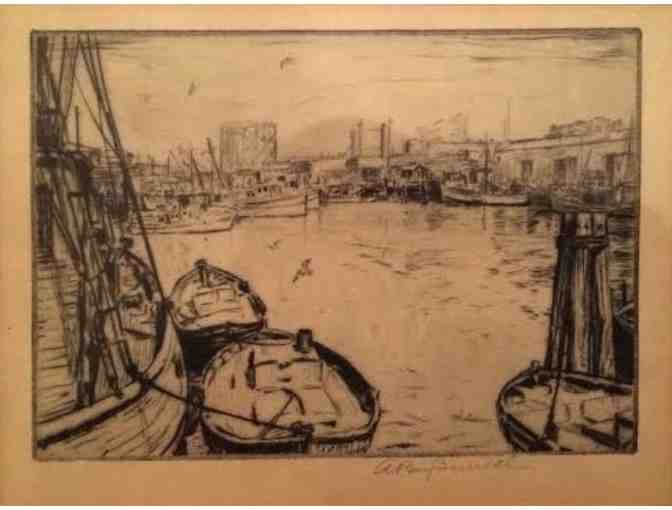 This ink-on-paper drawing is a delicate rendering of boats docked at a harbor. The 4 1/2" X 3 1/4" drawing is matted and held in a 11" X 12 1/2" frame.