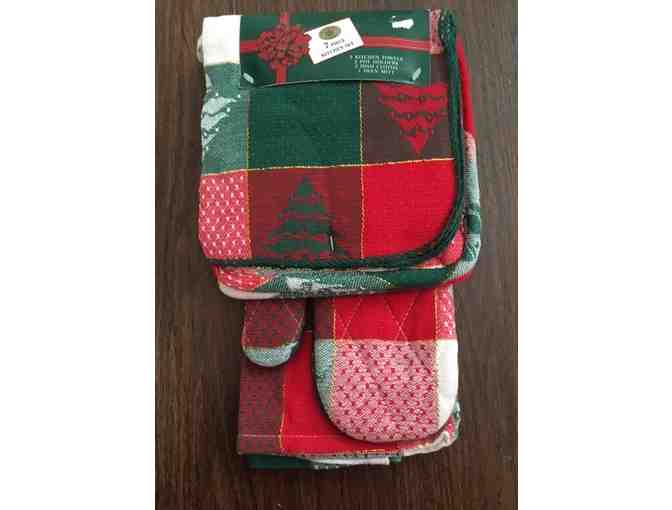 This Christmas set is comprised of 2 kitchen towels, 2 pot holders, 2 dish cloths and 1 oven mitt.