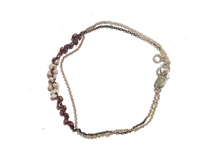 Two Sterling Silver chain strands, one oxidized with hand-sewn red and white freshwater pearls, fits standard wrist size, slightly adjustable by 2cm if need be.