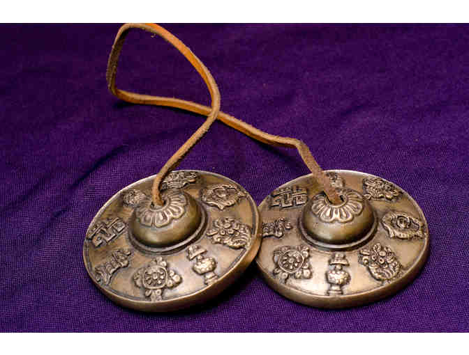 These tingshas are embossed with the traditional Eight Auspicious Signs common in Tibetan Buddhism and are made in Nepal.