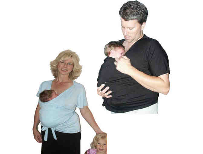 Skin-to-skin wrap designed for both Mom and Dad with Teeshirt sleeves. For Dad's increase by one size (Dad's medium would be Mom's large)
