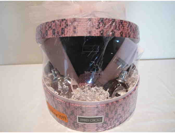 Get your glam on with this collection of Jimmy Choo lotion, Eau de Parfume Spray, Eau de Toilette Spray and stylish cosmetics bag!