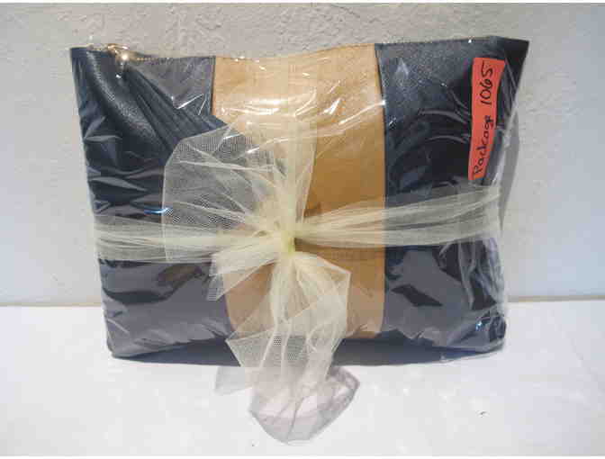 Fashion divas flock to Toss for the fresh patterns, unique color combos and functional shapes.This Toss tassel clutch is perfect for a night out. The clutch is navy and tan with a detachable shoulder strap.