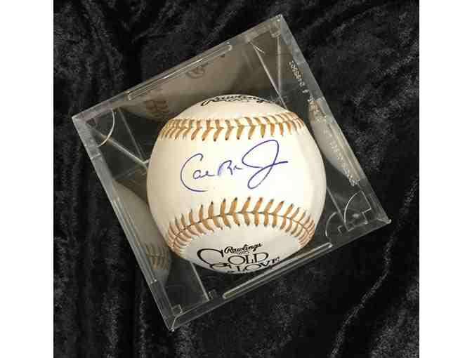 This Rawlings Gold Glove Award baseball is signed by Cal Ripken, Jr and includes the case pictured.
