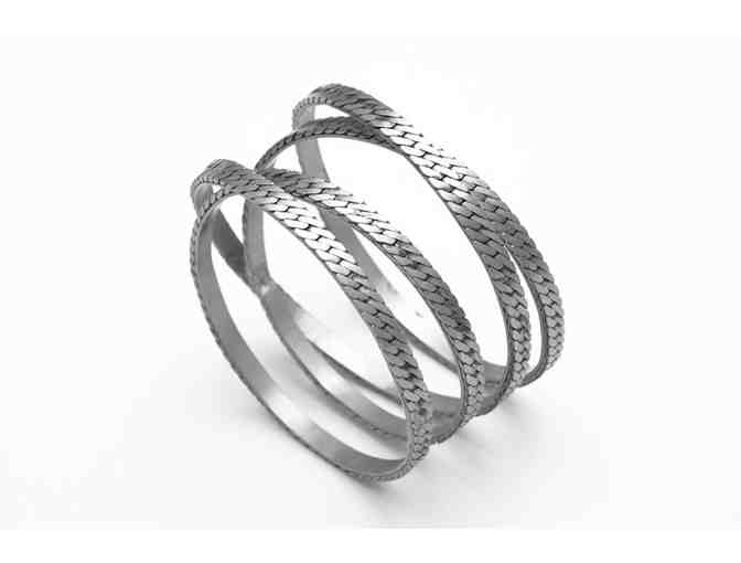 This handcrafted multi-bangle is made in brass and finished in a sterling silverplated oxidation. Get the look of many bangles in one with this unique piece from the 2015 collection.