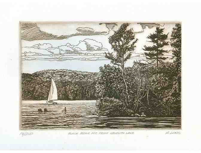 This 12"x9" (overall) etching of "Black Bear Mt. from Seventh Lake" is printed in brown tone details on a cream colored background. Signed and numbered by ADK member and artist Ryland Loos. (14/200), this etching reflects his exquisite skill and sensitivity...A rare accomplishment and a gift few artists enjoy. This beautiful etching is ready for framing!