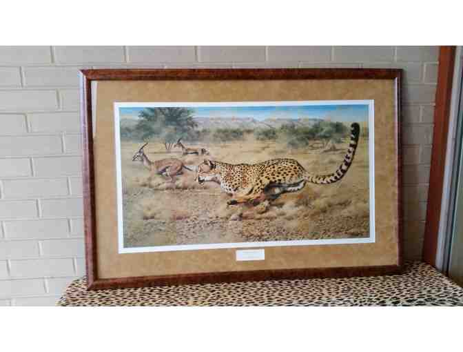 A beautiful framed giclee print depicting Angel from the Cincinnati Zoo, chasing antelope.