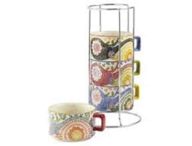 From Pier One Imports. Wake up to some boho-chic color with our set of porcelain mugs. Each is covered in its own unique pattern and stacks inside a metal caddy that saves space on countertops and kitchen islands.