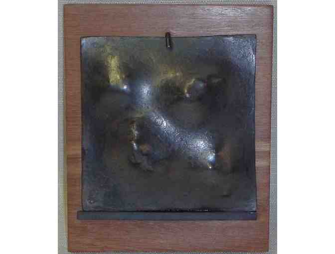 Handcrafted wood and metal piece adds a modern look to any wall. The piece evokes the magesty of the mountains. The piece is about 5 1/2 inches by about 6 1/2 inches. One-of-a-kind conversation piece!