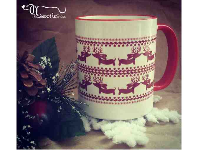 Exclusive Ugly Sweater Dachshund Reindeer mug from The Smoothe Store. This 11oz red ringer mug will keep your coffee warm and your spirits bright.