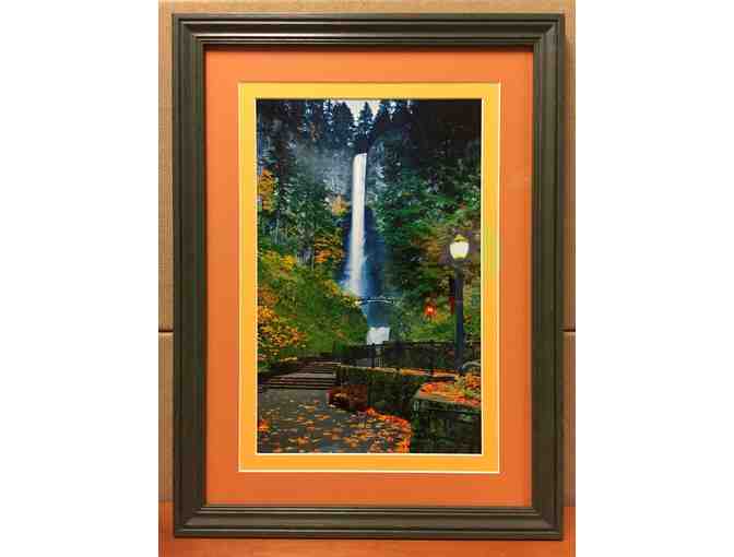 Multnomah Falls is a magnificent and memorable waterfall on the Oregon side of the Columbia River Gorge. This framed and matted photo dramatically captures the Falls from a distance with a park setting in the foreground.