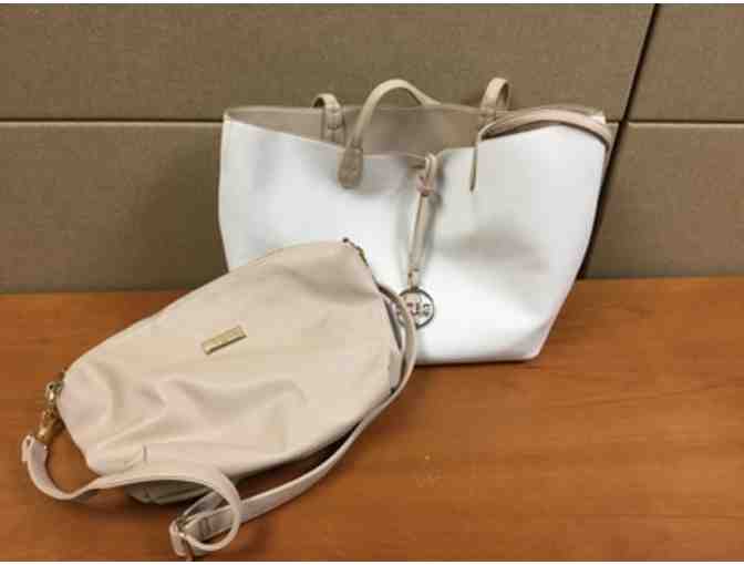 For the BCBG brand, this very affordable 2 piece purse & tote ensemble gets you from day to evening with it's versatile design. The large & roomy tote is reversible - cream on one side, tan on the other side. The purse is tan and the perfect size for carrying all your essentials.