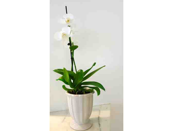 Orchid arrangement in vintage white ceramic kitchen jar by Brigitte Grosjean Vintage