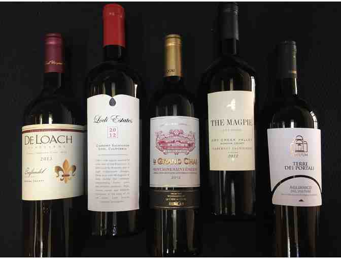 An assortment of wines for those who love reds! Wines included are: DeLoach 2013 California Zinfandel; Lodi 2012 California Cabernet, LeGrand Chai 2012 Bordeaux; The Magpie 2012 California Cabernet and Basillium 2012 Italian red.