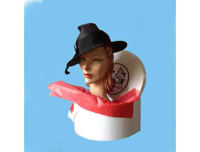 This beautiful and whimsical felt hat is accompanied by a hat box for safe storage.