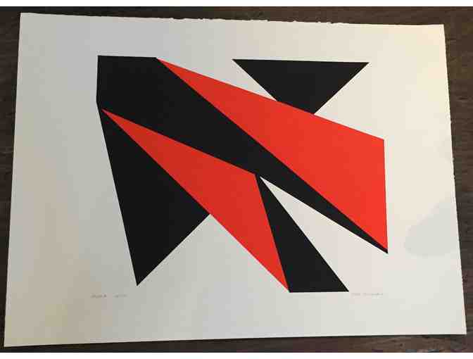 Helen Gerardia's striking Flight illustrates the artist's ability to use colors to construct space and depth while her use of negative space creates a unique balance within the piece. This impression is signed and numbered '47/50' by the Russian artist, Helen Gerardia in pencil. The 30 X 22" piece is unframed.