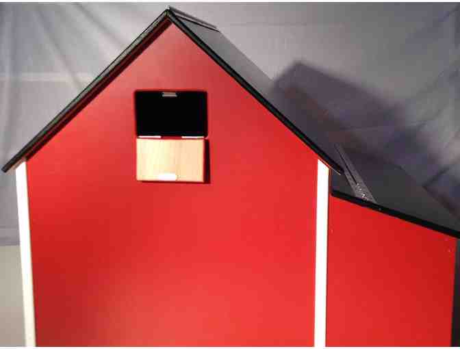 It measures 24”H x 30”L x 30”W and has two sets of sliding barn doors with openings of 10”x10” and 10”x12”. This barn has a hay mow for extra storage and a lean-to shed on the side for livestock.