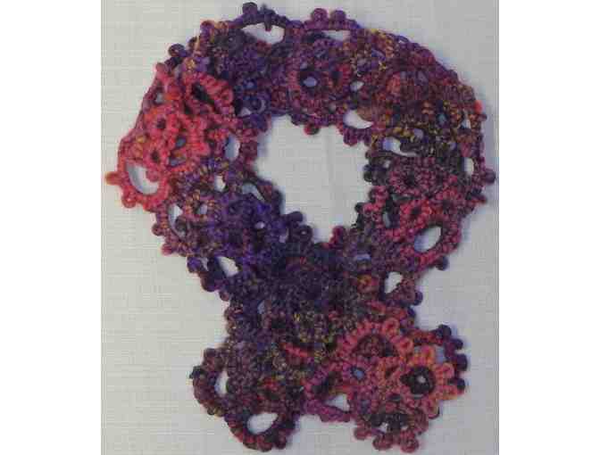 This lovely tatted scarf was made by our very own Membership Associate Julia Greiner with tatting needles and wool yarn. Impress your friends with this especially unique colorful scarf, as most tatting is usually in the form of a doily or lace edging on handkerchiefs made with very fine thread. Julia has been tatting for 20 years, a family tradition passed down the long line of women in her family.