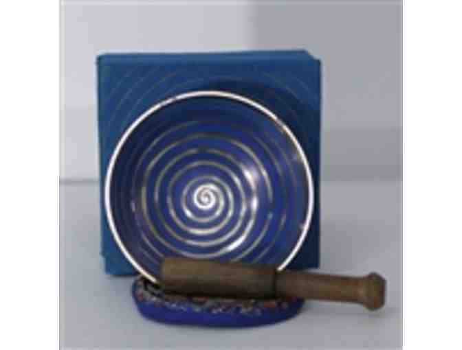 This 4.74" diameter singing bowl has a golden-colored swirl on the bottom. The set a cushion and mallet, and comes in a blue box with a golden-colored spiral on the top.