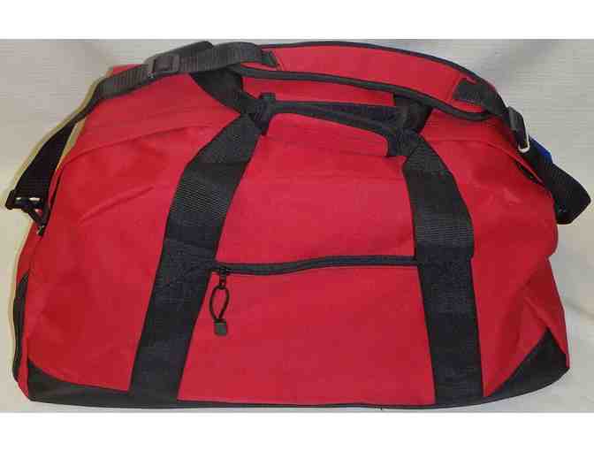 Port and Company red duffel with one main pocket (18x12x10) and two outside pockets and one inside pocket.