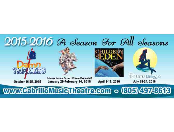 Two mezzanine tickets to the Cabrillo Music Theatre production of CHILDREN OF EDEN, running from April 8 to 17, 2016 at the Fred Kavli Theatre in Thousand Oaks.