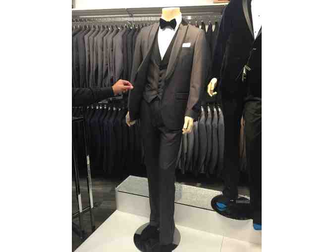 Lawrence Clothier located in the Springfield Town Center, Virginia has donated a tuxedo charcoal gray with black lapels. This included jacket, vest and pants.