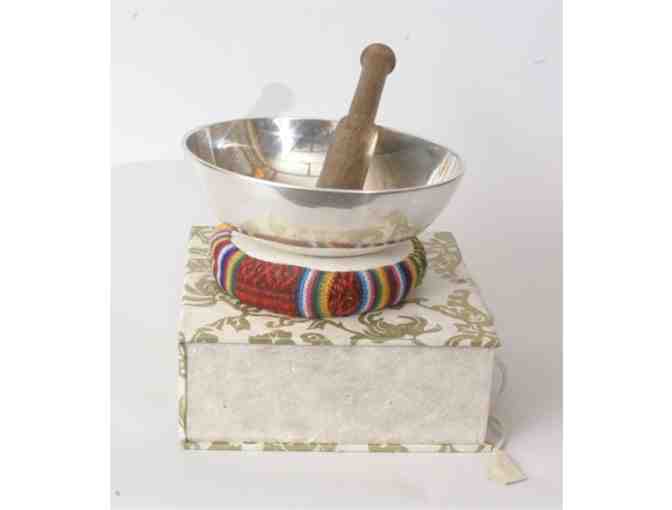This singing bowl set includes a 5"D singing bowl, a cushion and mallet, and comes in a beautiful white and gold gift box.