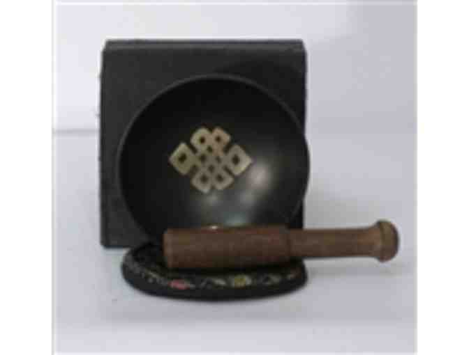 This singing bowl gift set includes a 4"D singing bowl with an gold-colored Eternal Knot on the bottom, a cushion and mallet, and comes presented in an elegant black box with a gold-colored Eternal Knot on the top.