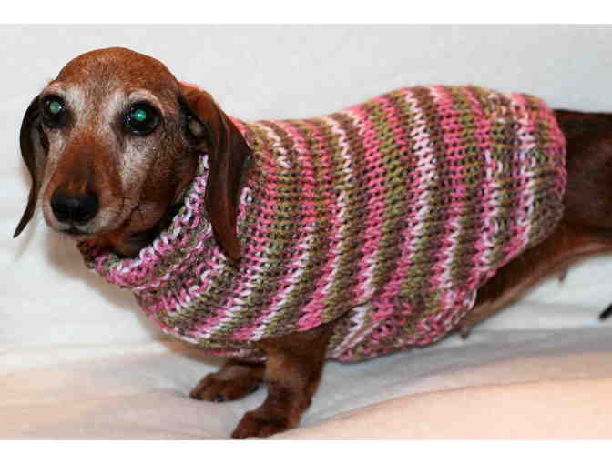 This stunning sweater was handknit and sized especially for a mini dachshund. It is made of very soft yarn and has some "give" to it. Our model Queen is a mini dachshund who weighs 9 pounds.