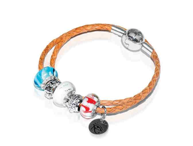 Strung on Genuine Leather Double IRIS Starter Wrap, Joseph Nogucci has designed a bracelet adorned with three (3) Silver Plated IRIS Single Core Murano Beads in Red, White & Blue accompanied by 2 beautiful Rhodium Plated Charms.